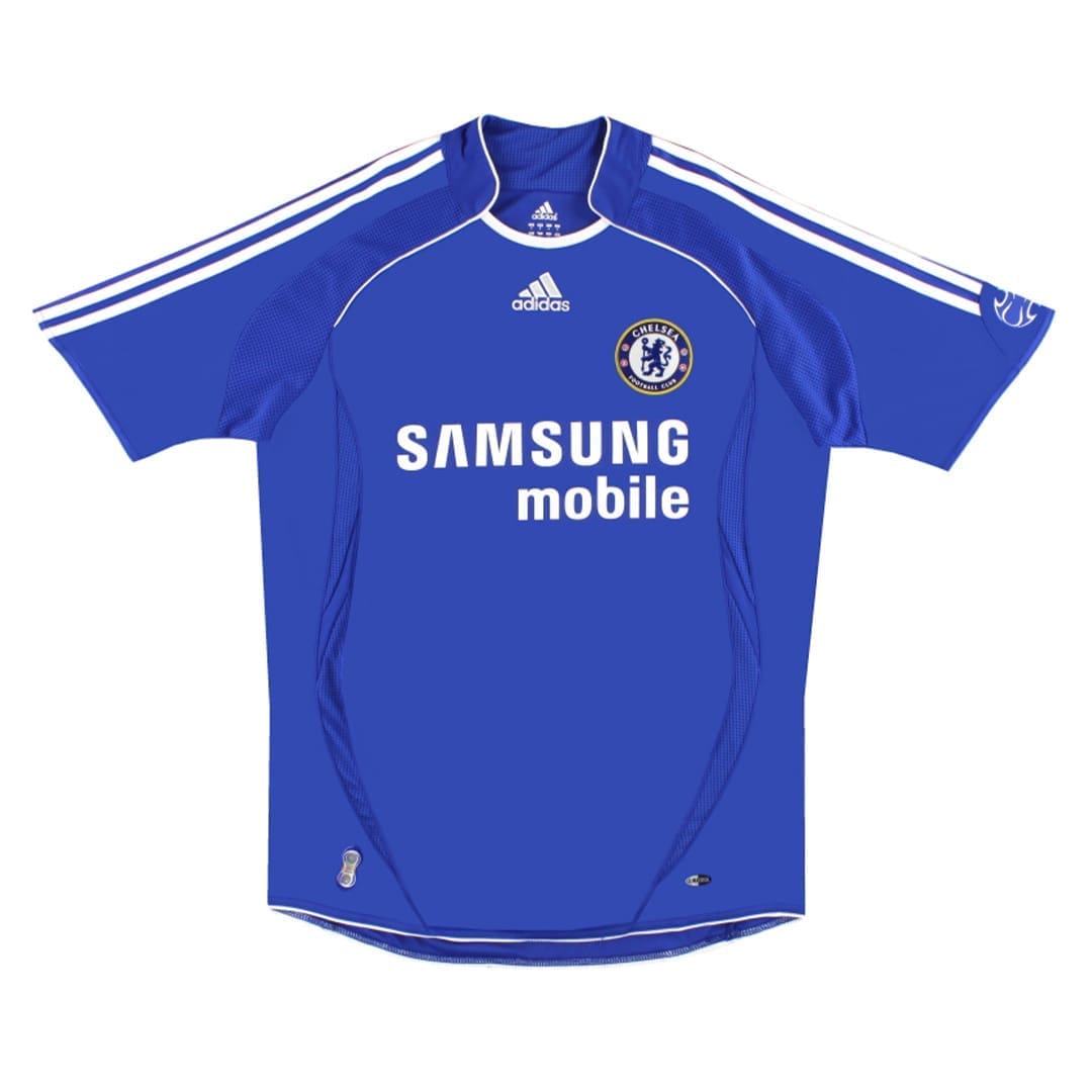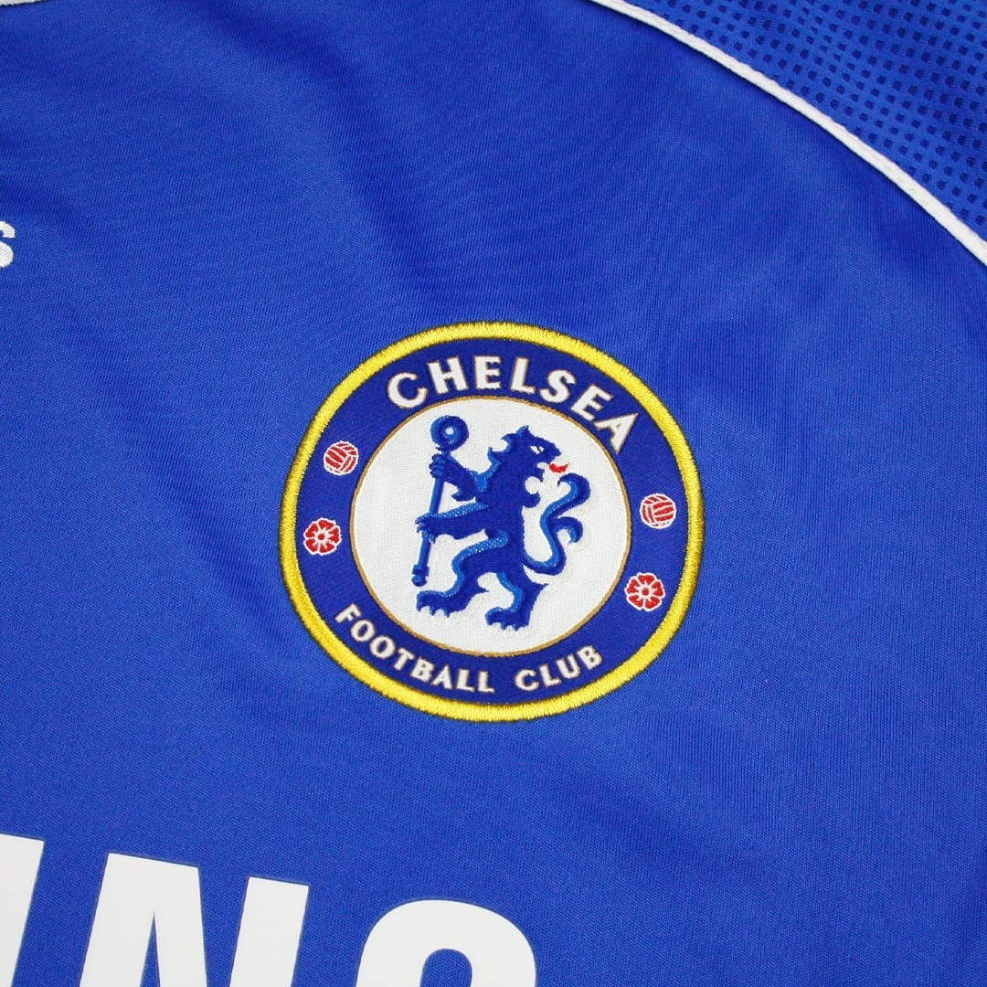 Home shirt as worn when Chelsea won a cup double in the 2006-07 season in the FA Cup and League Cup. However, after a disappointing 1-1 draw with Rosenborg in the 2007-08 Champions League campaign Jose Mourinho left the club by mutual consent and was replaced with Avram Grant. Despite not winning any trophies in the 2007-08 season Chelsea took the Premier League title race to the last day of the season, and made it to the 2008 Champions League final.