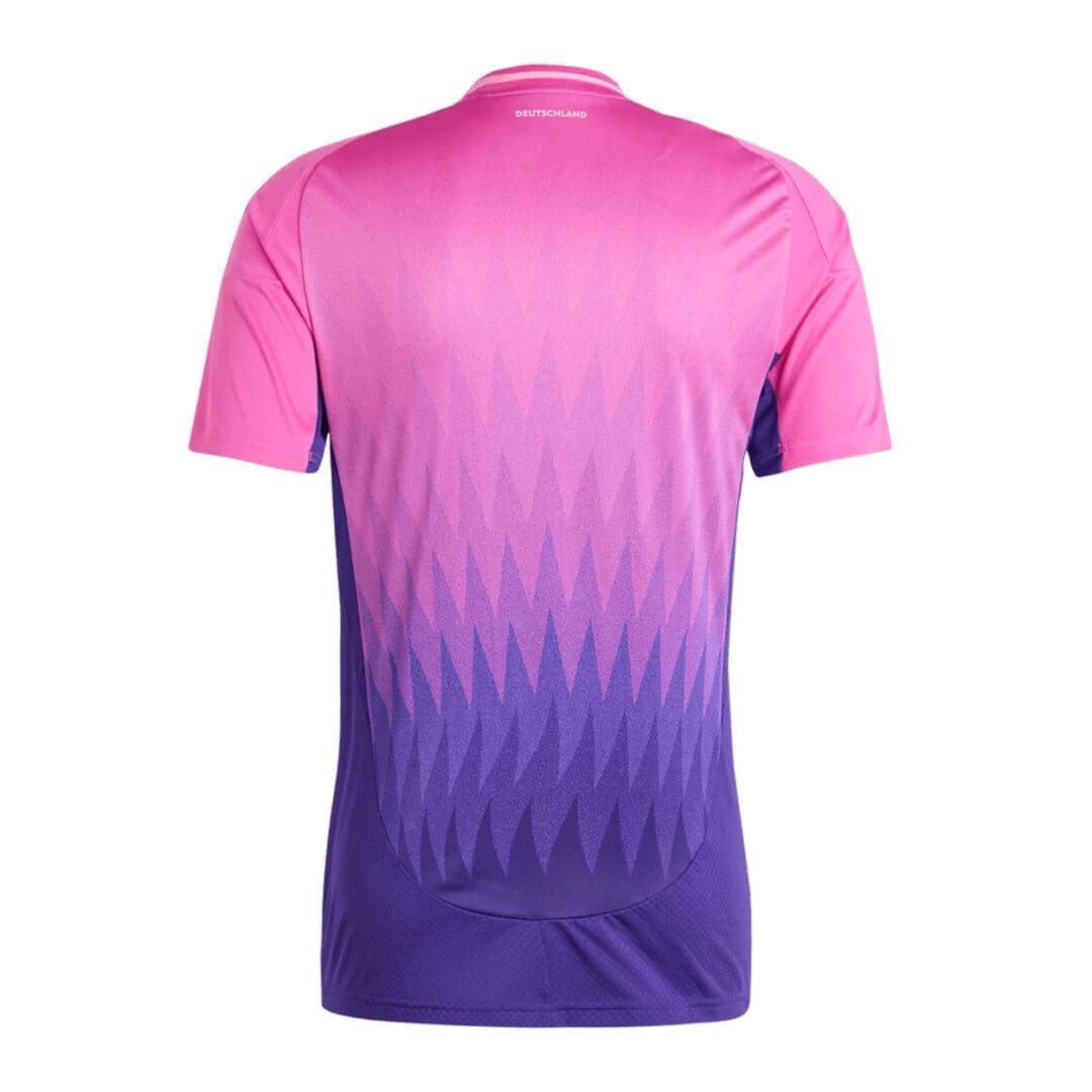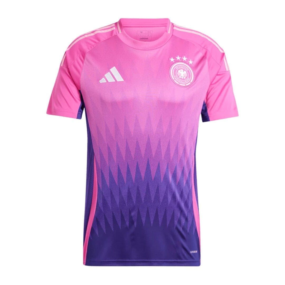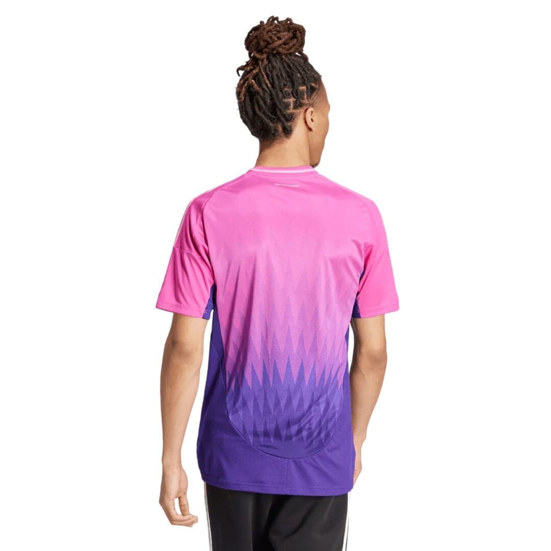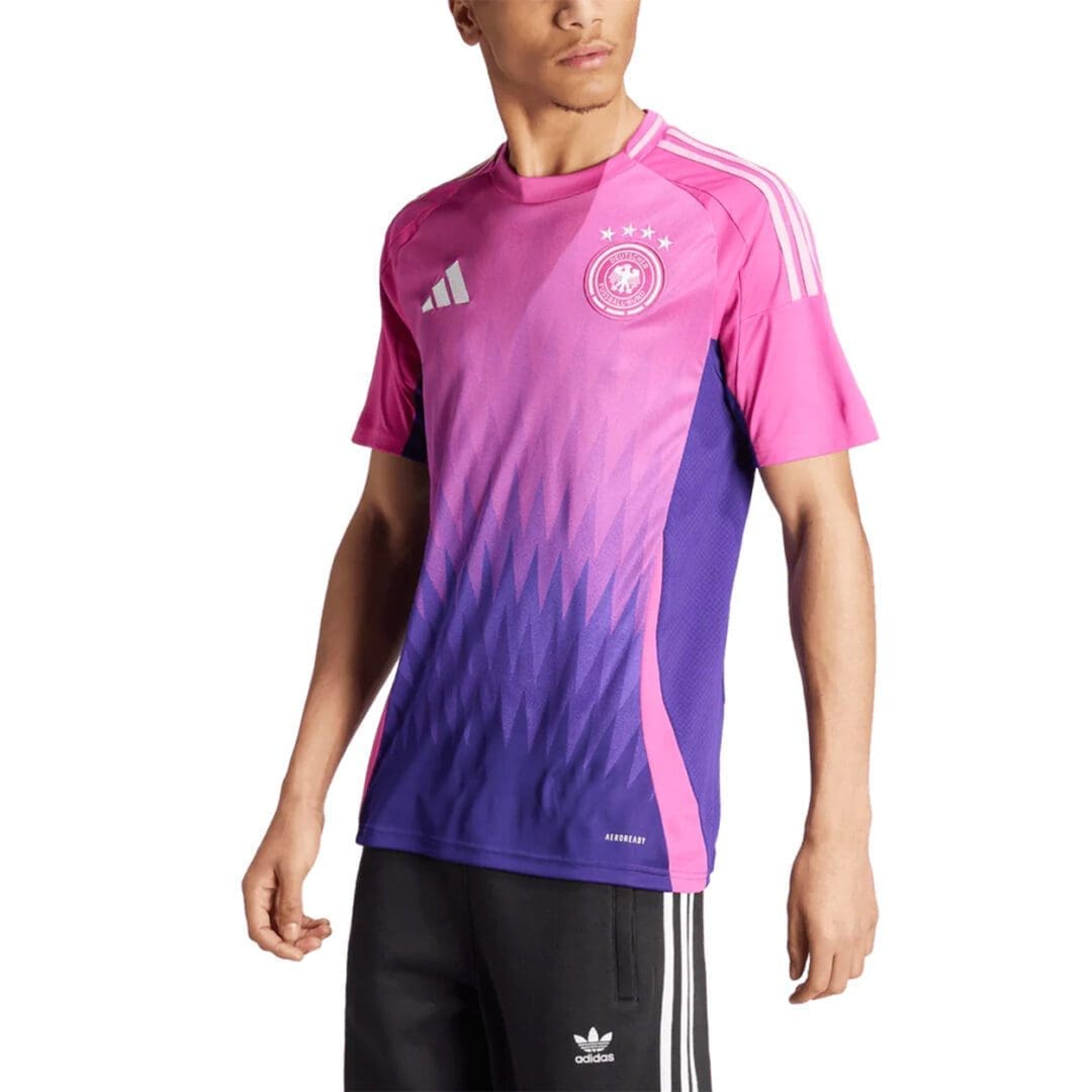 Elevate your soccer fandom with a fresh twist on tradition. The adidas Germany away jersey features a vibrant design inspired by eagle feathers, adorned in striking purples and blues. Engineered with moisture-managing AEROREADY technology and adorned with a premium woven team badge, this jersey offers both comfort and style for dedicated supporters.