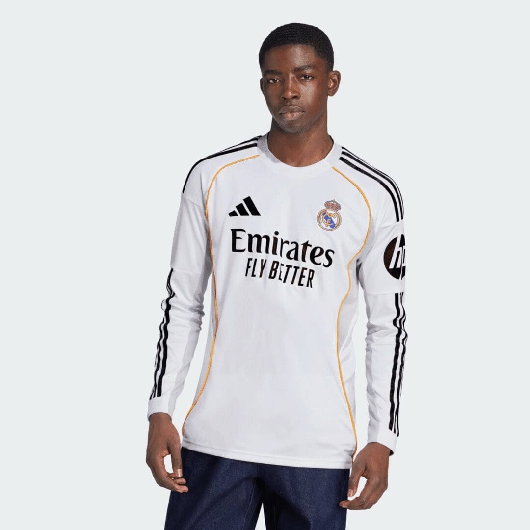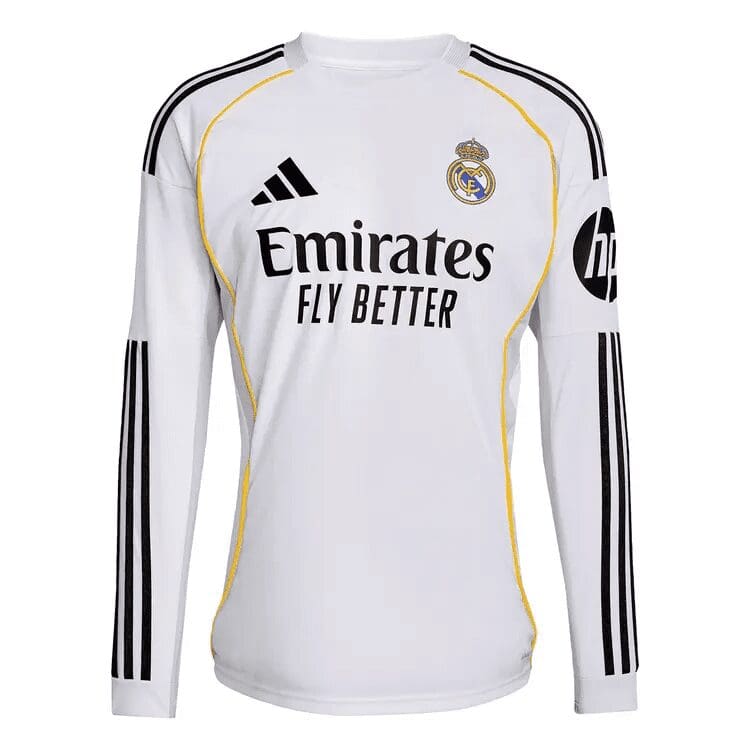 Celebrate one of the most legendary clubs in football history with the 25/26 Real Madrid home long sleeve jersey. This modern update to the classic all-white look blends heritage with innovation, delivering both style and function. Made with high-performance moisture-wicking fabric, it keeps you dry and comfortable whether you’re on the pitch or in the stands. The detailed crest and signature accents highlight the club’s storied identity, while the streamlined fit ensures a sleek and athletic silhouette. Ideal for collectors, supporters, or anyone who respects the game’s elite.