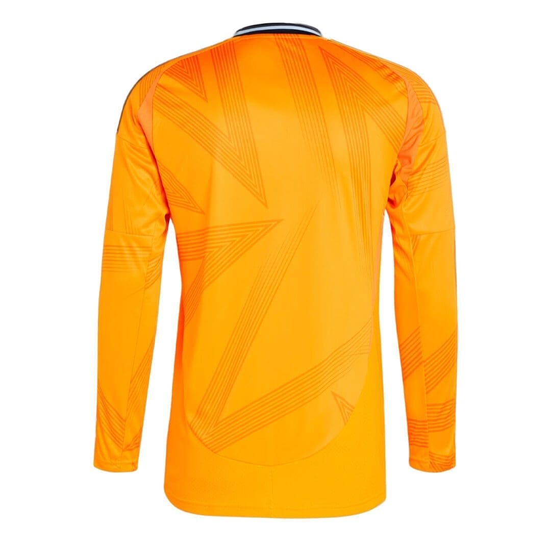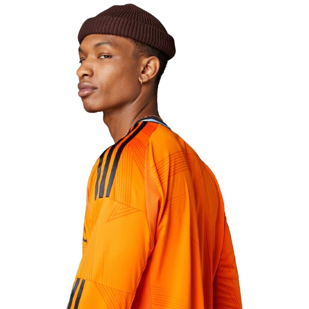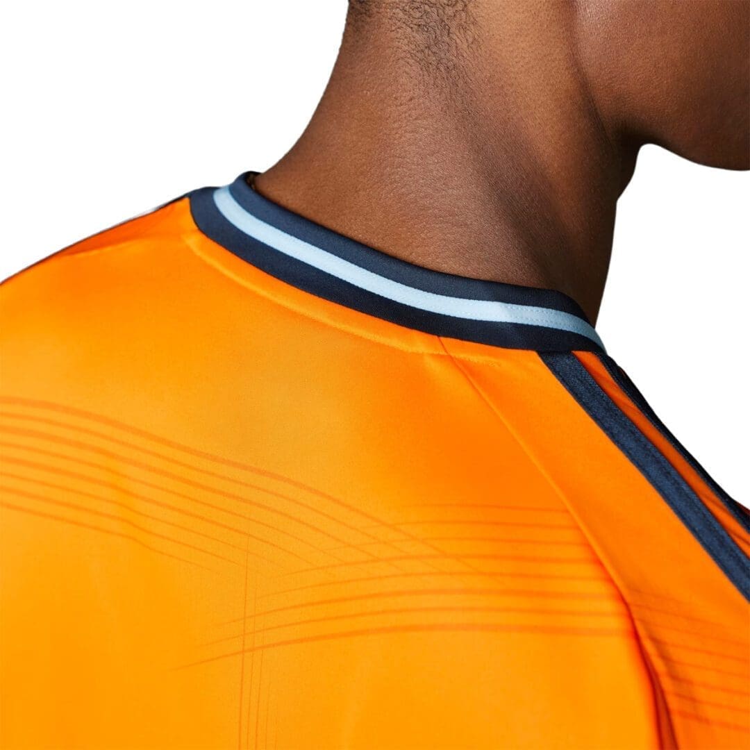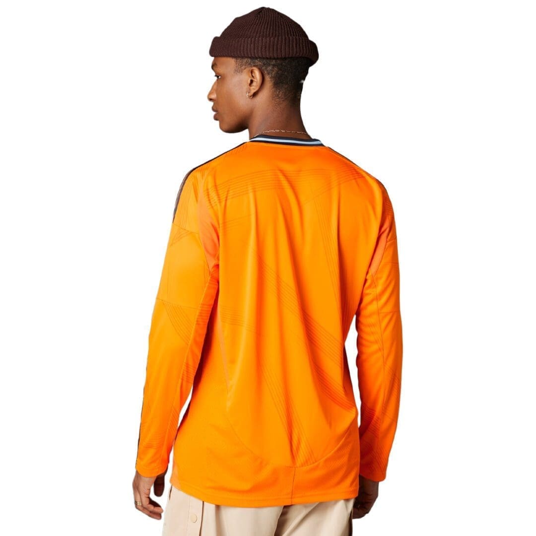 Created to complement Real Madrid’s shimmering skills, this long sleeve away jersey from adidas stands out with a vibrant orange base and an abstract, star-inspired design. Its dark blue details include a woven club badge.