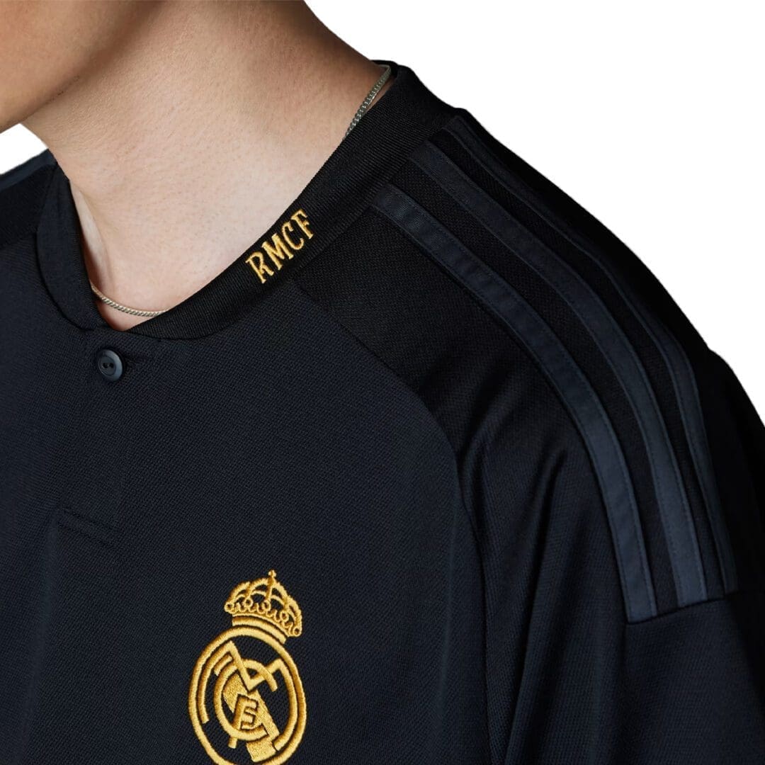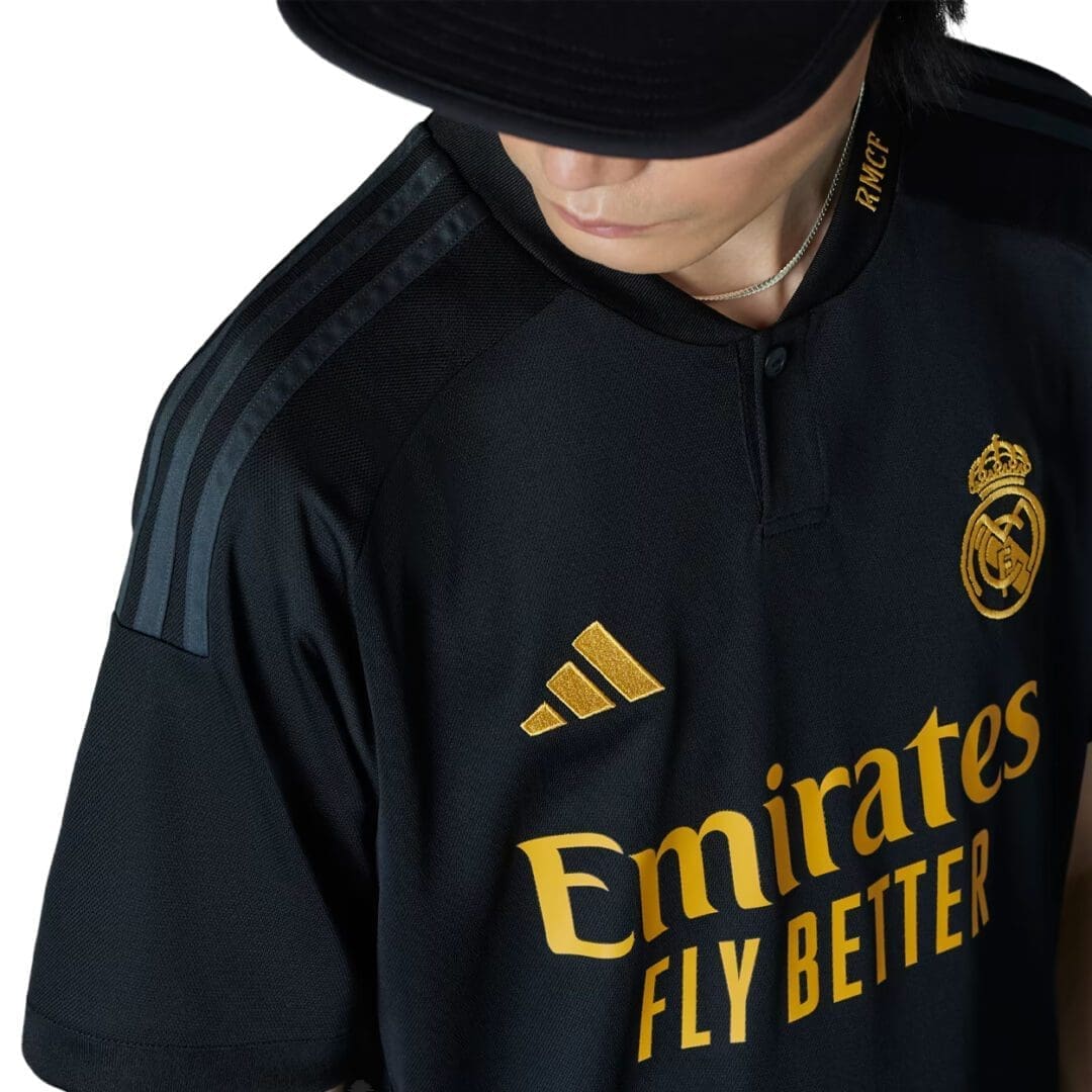 Soccer elegance. It’s hard to describe, but you know it when you see it. A nod to Real Madrid’s sparkling away performances, the Real Madrid 23/24 Third Jersey keeps things classy with a black base and embroidered “RMCF” wording on the left side of the Henley collar.