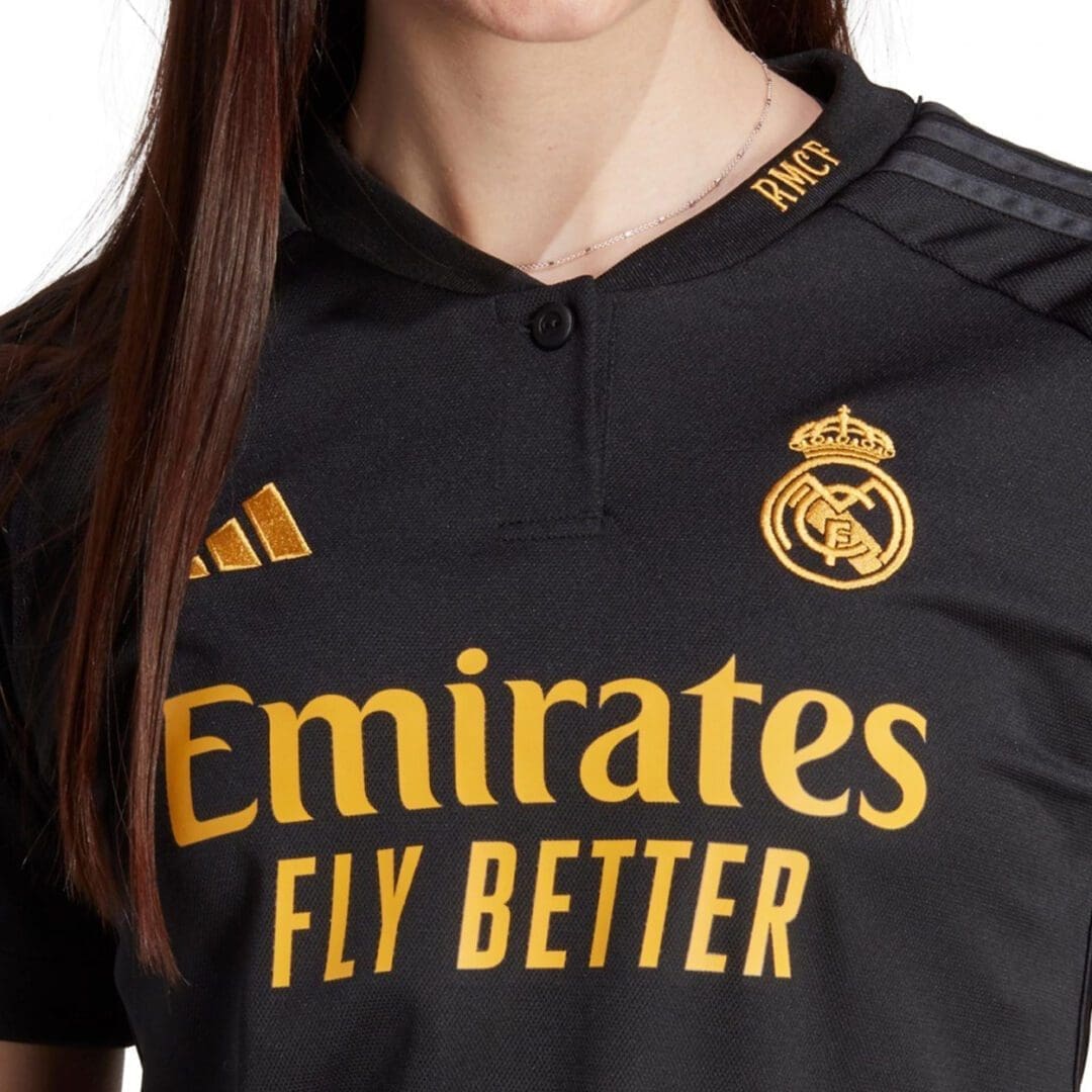Soccer elegance. It’s hard to describe, but you know it when you see it. A complement to Real Madrid’s sparkling away performances, this adidas third jersey keeps things classy with a black base, carbon 3-Stripes and a golden “RMCF” embroidered into the collar.