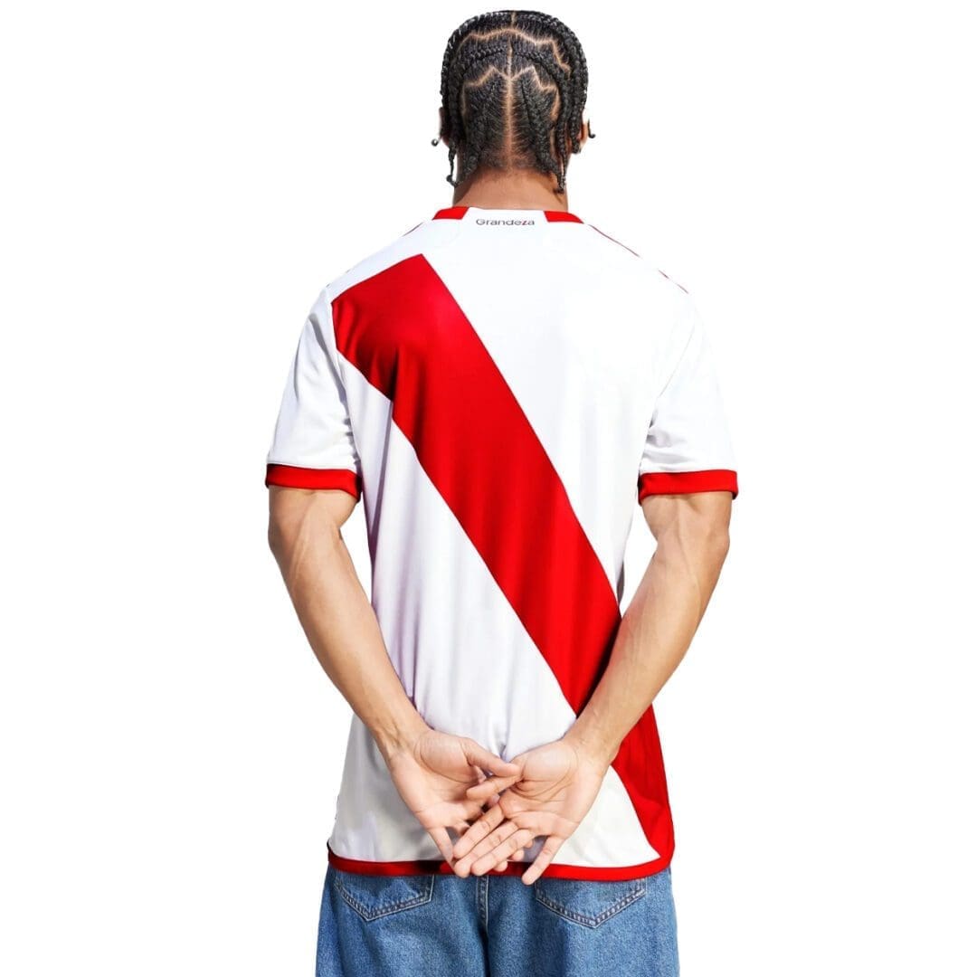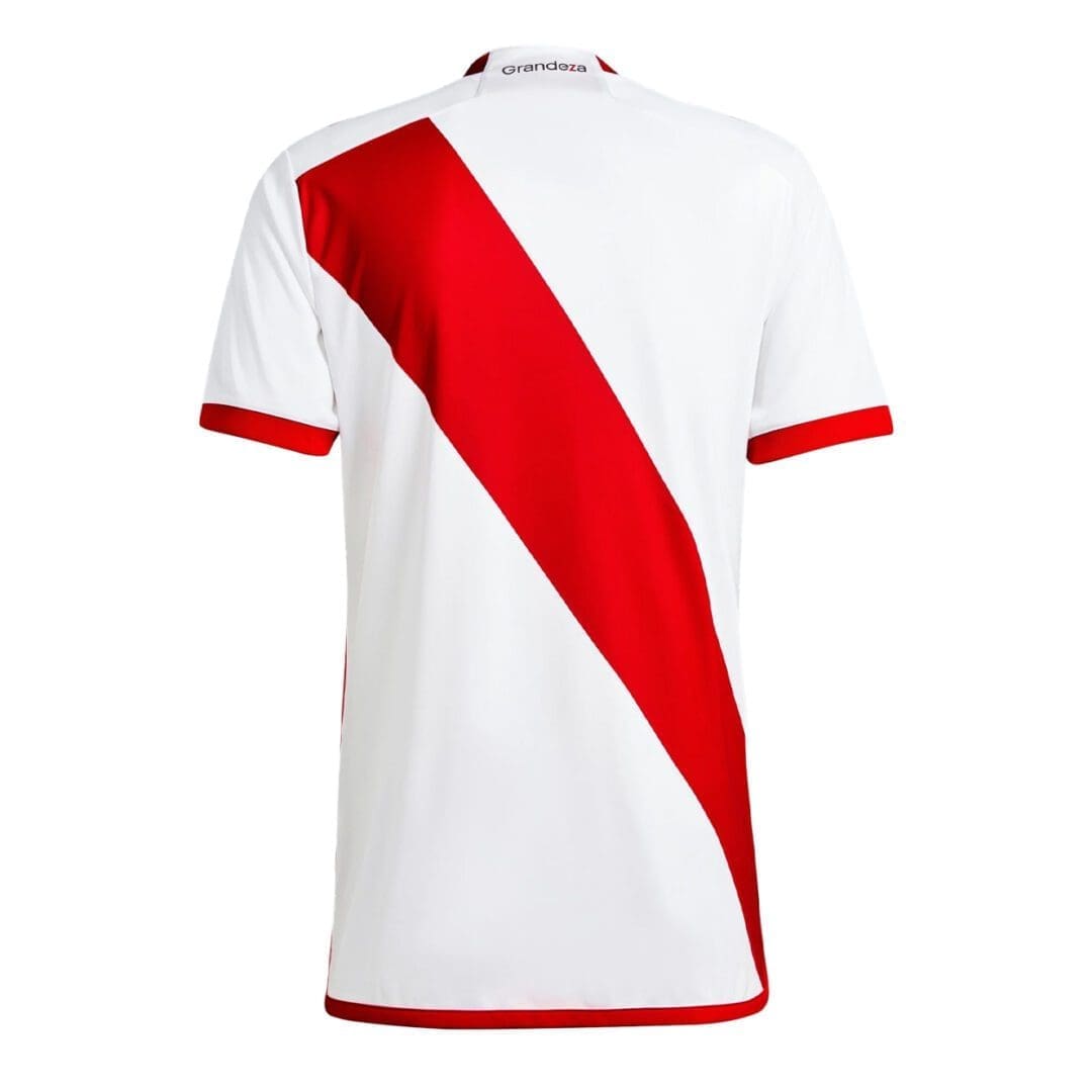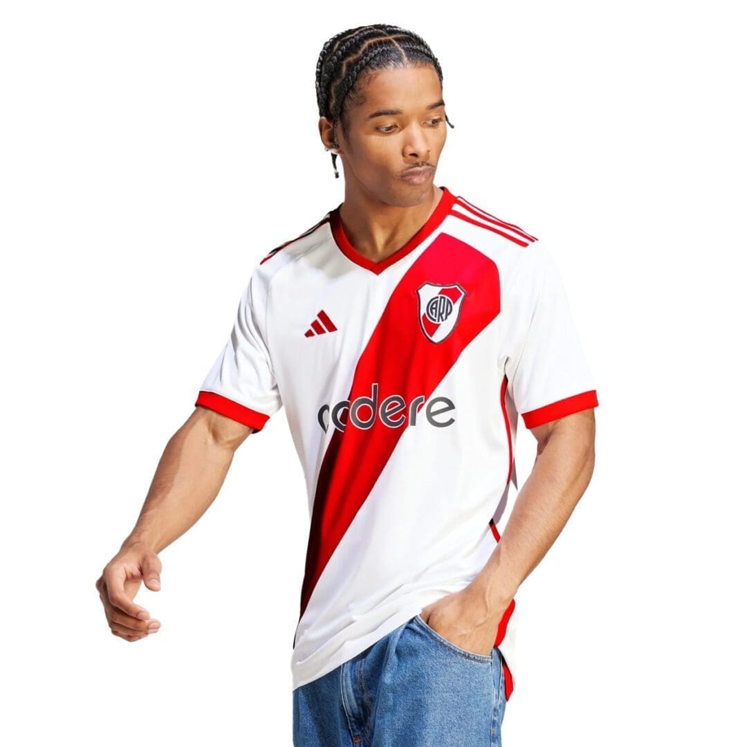 Saluting Los Millonarios’ soccer fortress on its 85th anniversary. Mimicking the skewed dimensions of the red sashes visible when El Monumental lies empty, this adidas River Plate home jersey pays tribute to the club’s beloved stadium.