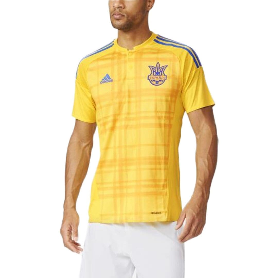 Home shirt as worn when Ukraine were competing in the 2016 European Championship, being knocked out in the group stage of the competition after finishing bottom of their group after losses against Germany, Poland and Northern Ireland.