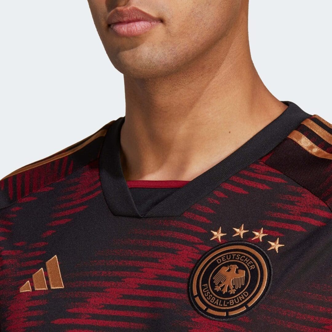 Shooting for the stars. It doesn't matter how successful they've been in the past, Germany are always in a hurry for more silverware. Borrowing the colors of the country's flag, this adidas away jersey blurs the D of "Deutschland" to reflect the dynamic soccer played by the current squad.