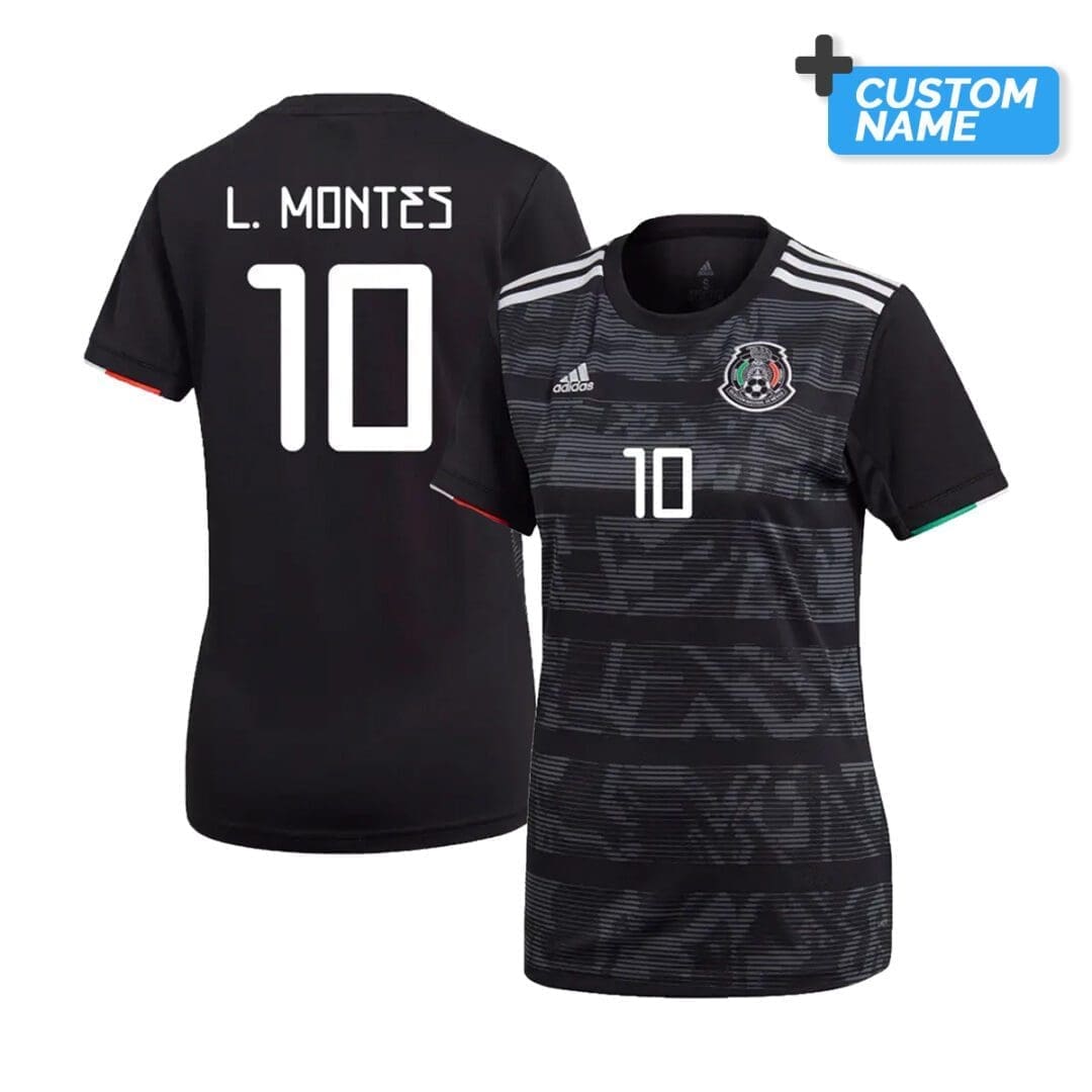The 2019 Mexico Home Jersey features an Aztec-inspired print on the front panel. The federation badge incorporates black to match the jersey. Country colors green, red and white line the cuffs, with “Soy Mexico” printed inside.