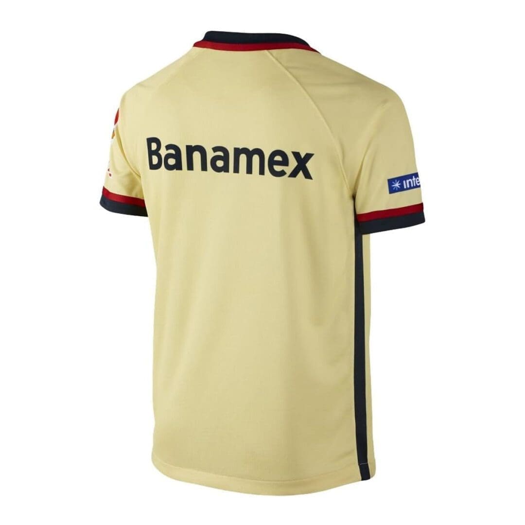 Nike Clube America 2016-17 home Boys shirt in yellow.V-neck design with navy blue/red trims.Embroidered team crest and logo.Sublimated Sponsor in front.Aguila logo is placed inside the neck.Sublimated sponsors on both sleeve and at the back.