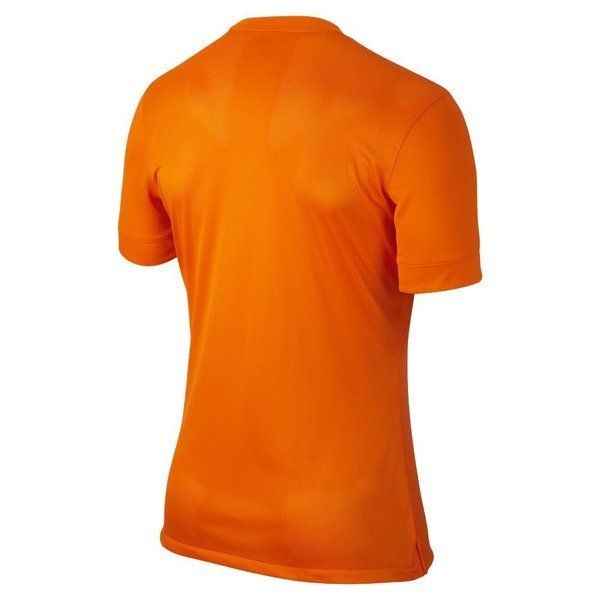 Nike Holland 2014 Official home shirt in orange. V-neck design with embroidered team crest and brand logo. Inside the neck is a small royal crown inside a triangular pennant and a ribbon with Dutch colors(red/white/blue) is stitched across inside the neck.