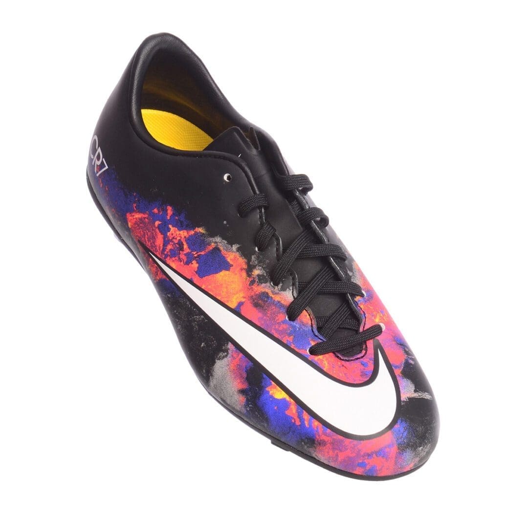 Children’s model of popular boots from the collection of Cristiano Ronaldo. Designed for playing football on natural, hard grass fields. As well as areas with artificial turfs of the latest generations. The upper material is made of artificial leather with a pattern in the form of lava from an erupting volcano. Fine texture promotes better control over the ball.