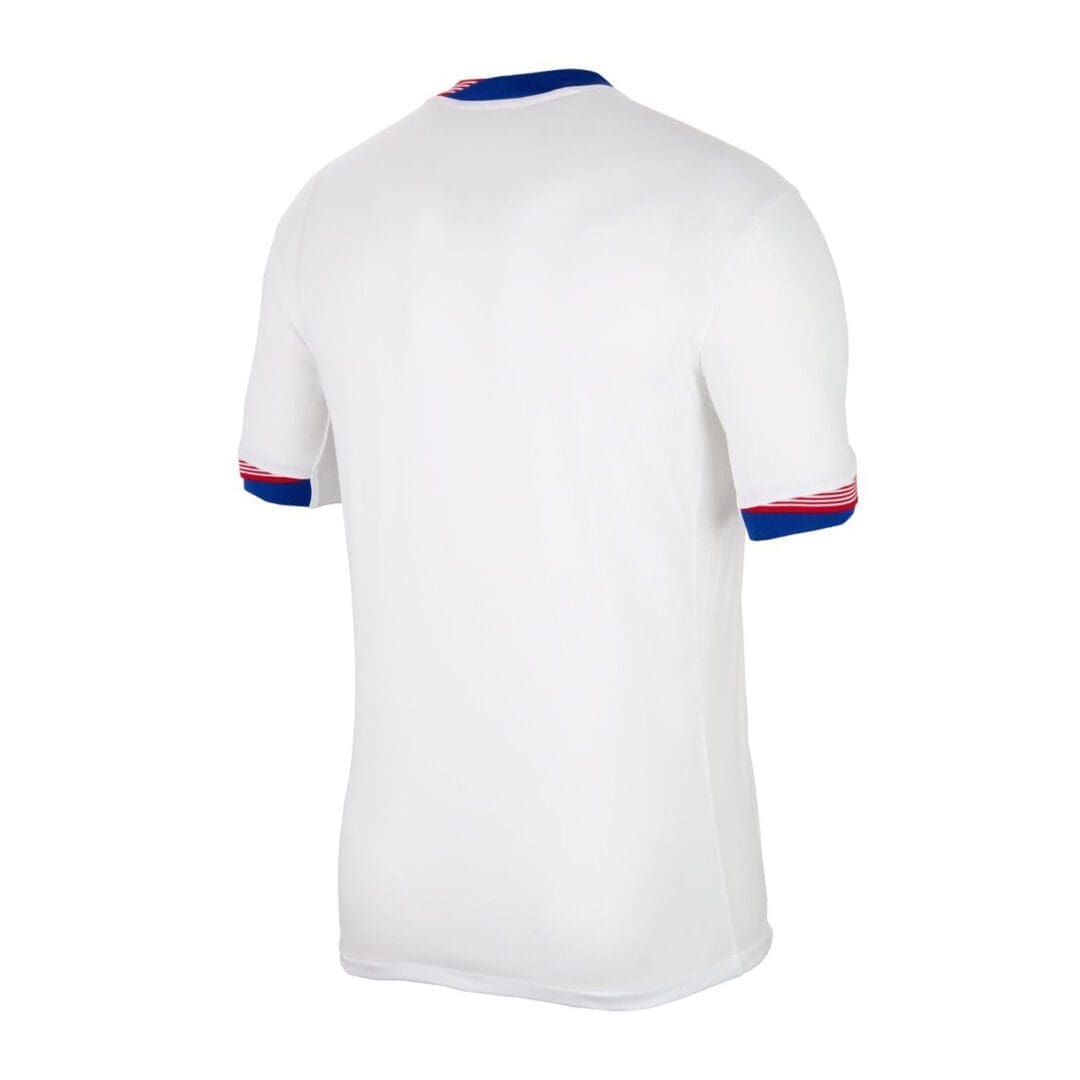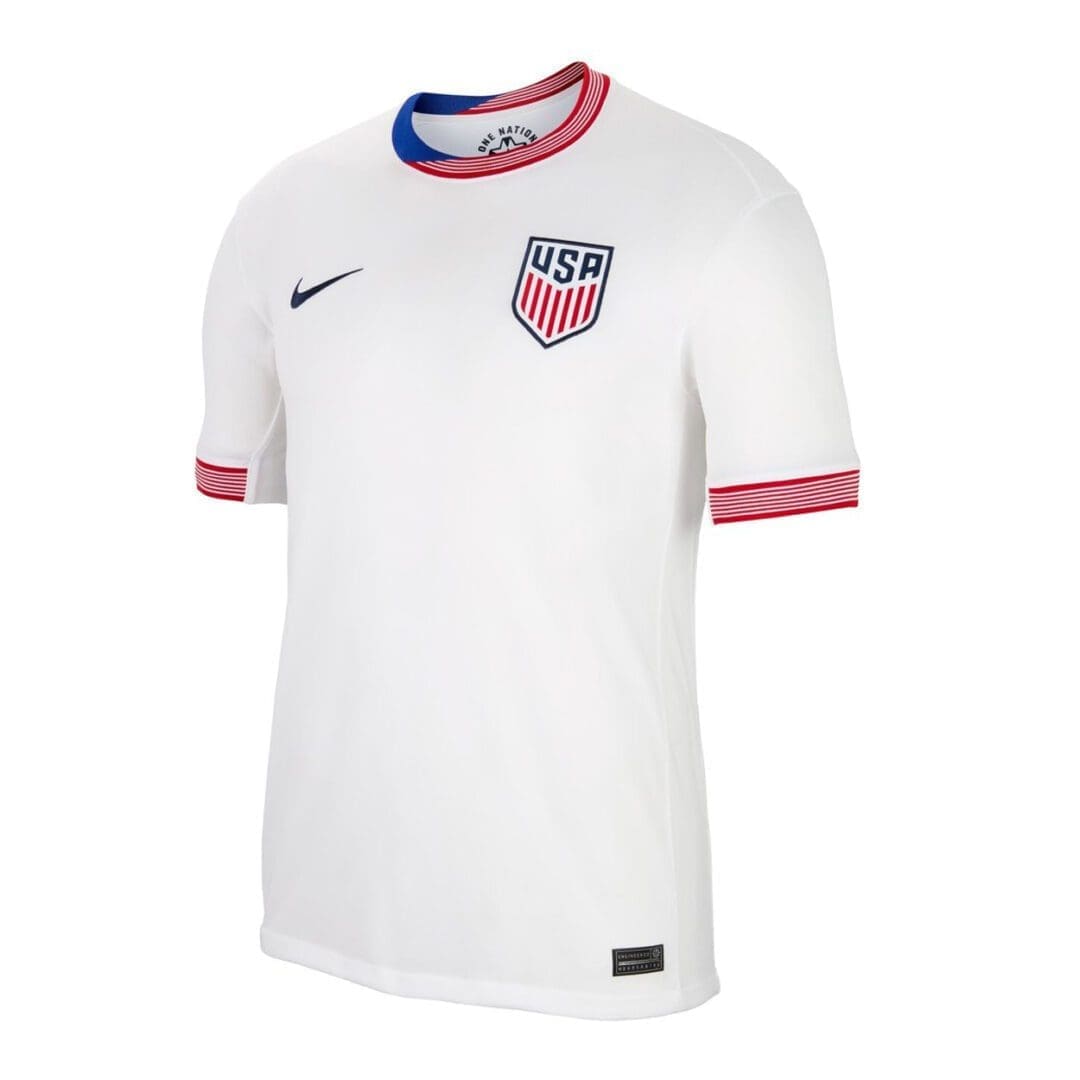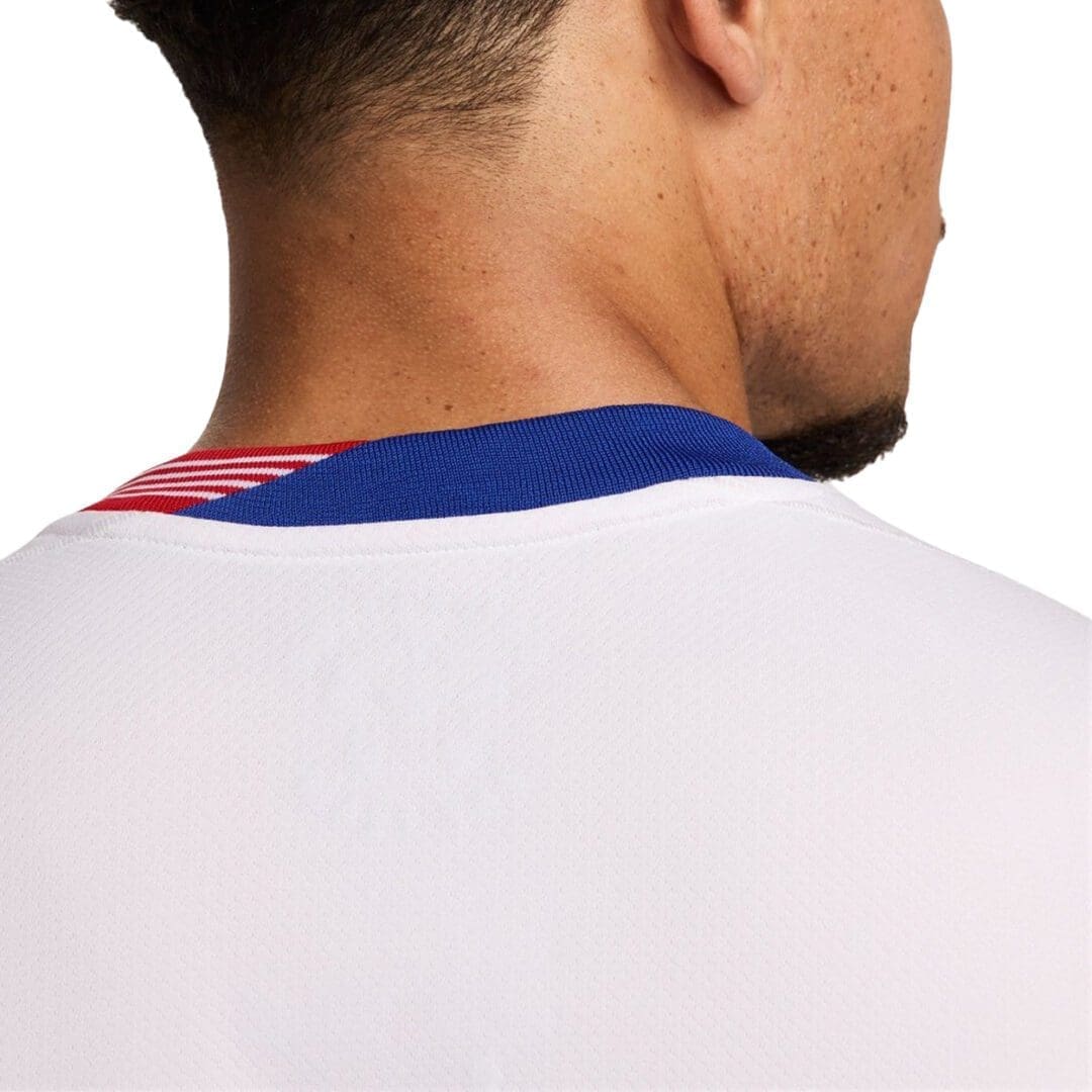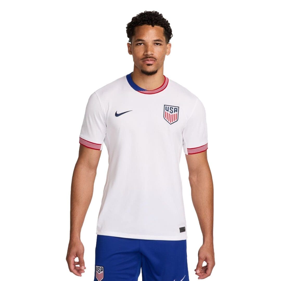Stand out with its striking red, white, and blue graphics found on the 2-part collar and the sleeve cuffs. Made with Nike Dri-FIT moisture-wicking technology, this replica jersey keeps you cool and comfortable when the game heats up. Whether you are in the stands are cheering from home, this Nike USA 2024 Men's Home Stadium Jersey will show off your USA pride.
