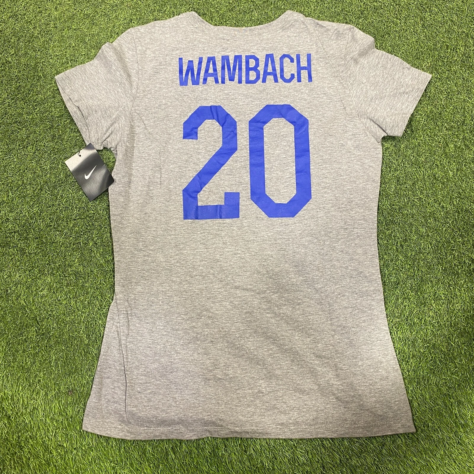 Show your support for the US Women’s National Soccer Team with this Nike USA Women’s Wambach #20 Tee Shirt in gray. The shirt is made from high-quality materials and features the iconic Nike Swoosh. It is officially licensed and perfect for soccer fans who want to show their love for the team.