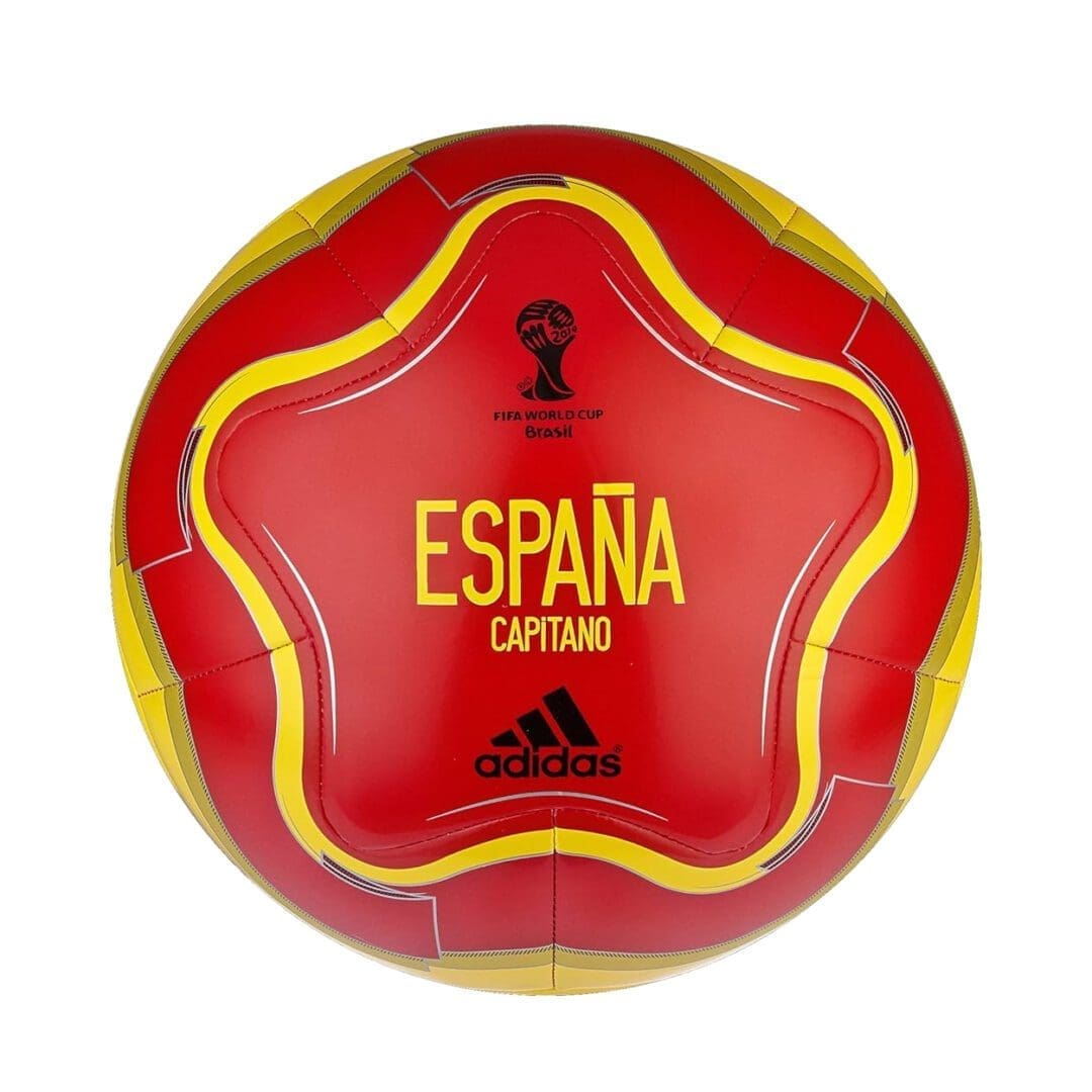 With bright yellow lettering reading “Espana” and adorned with black World Cup 2014 Brazil and adidas logos on a large red star-shaped panel outlined in yellow, this ball is a symbol of pride for fans. Crafted from tough thermoplastic urethane and machine-stitched for durability, it offers a scuff-resistant surface and reliable hold for vigorous use on the field.