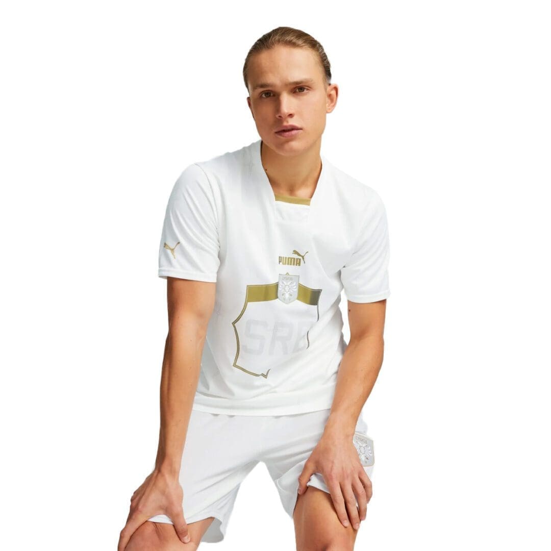 The Eagles have landed. In this 2022 Serbia Away kit, gold accents and bespoke front panel graphics celebrate Serbia’s footballing heritage.