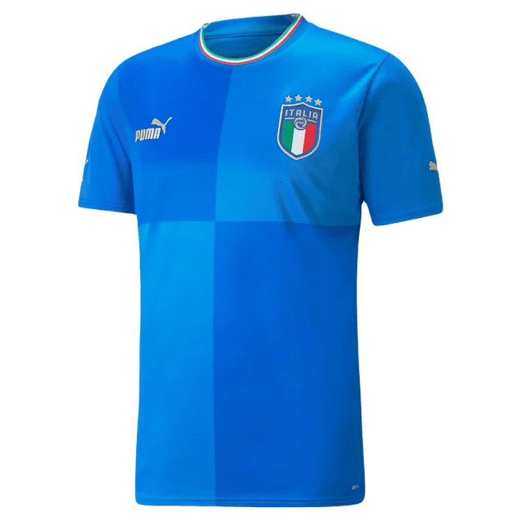 Featuring gold accents, retro fonts, and proud references to the triumphs of 1934, 1938, 1982, and 2006, the front of the jersey is split into tonal quadrants to honour the four generations of World Champions.