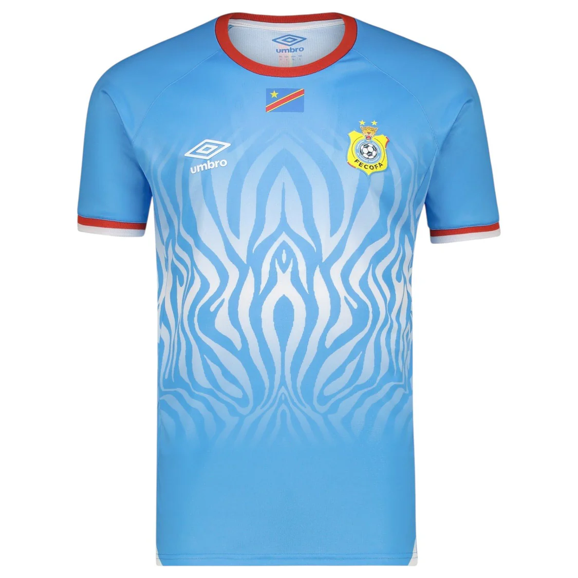 A striking blue base commands immediate attention, while a bold flowing pattern inspired by the leopard moves dynamically across the body — creating energy and motion even when standing still. Accents of red and white trim the ribbed collar and cuffs, echoing the colors of the national flag. The official FECOFA crest and Umbro branding sit proudly on the chest, honoring a legacy that includes two Africa Cup of Nations titles. In a world of predictable kits, this one refuses to blend in.