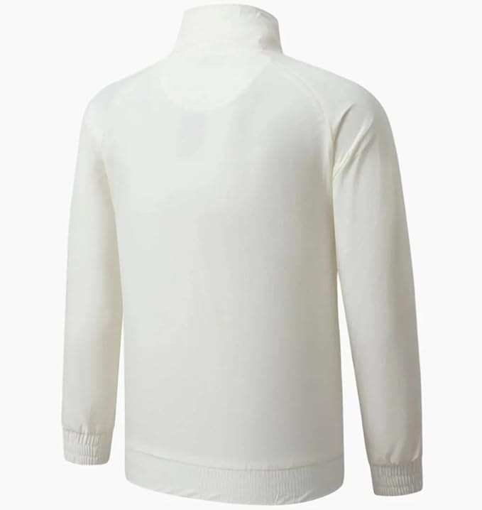 - Design: Solid white with high-neck collar and zip closure for a modern, sporty look.