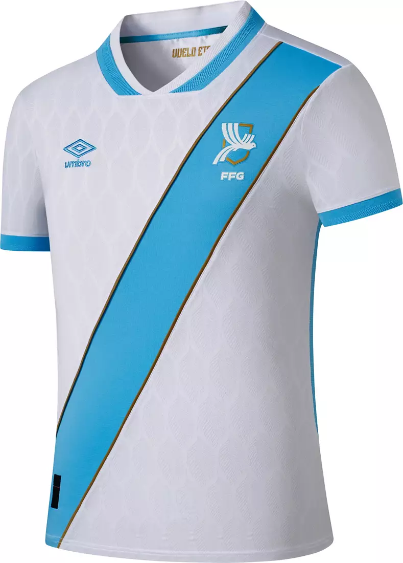 The jersey features a subtle all-over graphic inspired by the Resplendent Quetzal, Guatemala’s national bird, along with the iconic diagonal sash across a sky blue base. Gold accents add a premium touch, while the newly designed federation badge showcases a Quetzal rising within a shield—representing strength and unity.
