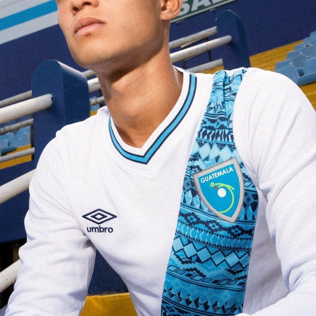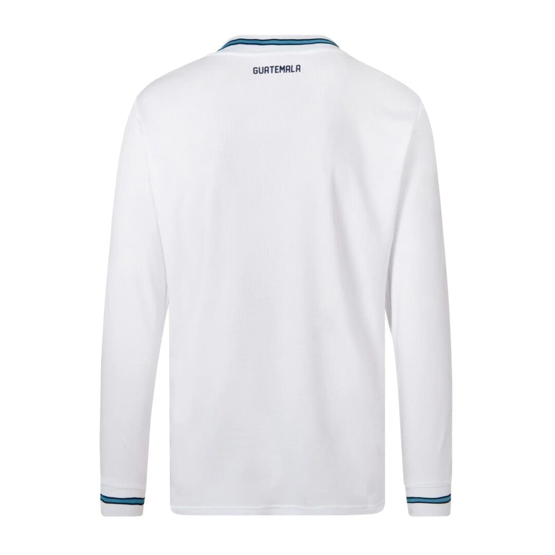 Umbro Guatemala 2023 home Official long sleeve shirt in White.Sky blue sache with design is set diagonally in front of the shirt.