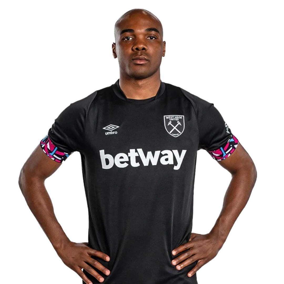 - Woven white and claret applique crest alongside embroidered Umbro branding